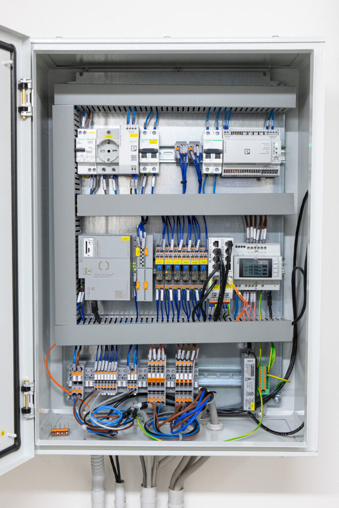Connectivity, time synchronization and high measurement accuracy require additional components in the control cabinet. For the connection of the network operator via fiber optic cable, a compact switch of the FL Switch 1000 series is used, which functions as a media converter. To ensure the minimum accuracy class of 0.5 percent of active power (P), reactive power (Q) and 0.2 percent of voltage (V) required at the connection point, an EMpro energy data acquisition device is used. The modular I/O modules of the Axioline SE product family are used to easily accommodate the digital logic signals of the Central Plant Controller. They line up on the right side of the PLCnext Control and, due to their free slots, enable network expansion without conversions.