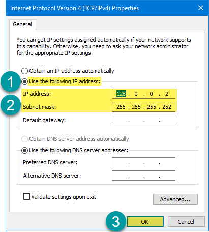 - Enter an IP address and a subnet mask that correspond to the IP address of the USB-C interface of the controller.