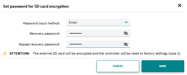 ↪ The encryption password is saved on the controller and the SD card encryption is scheduled for execution.