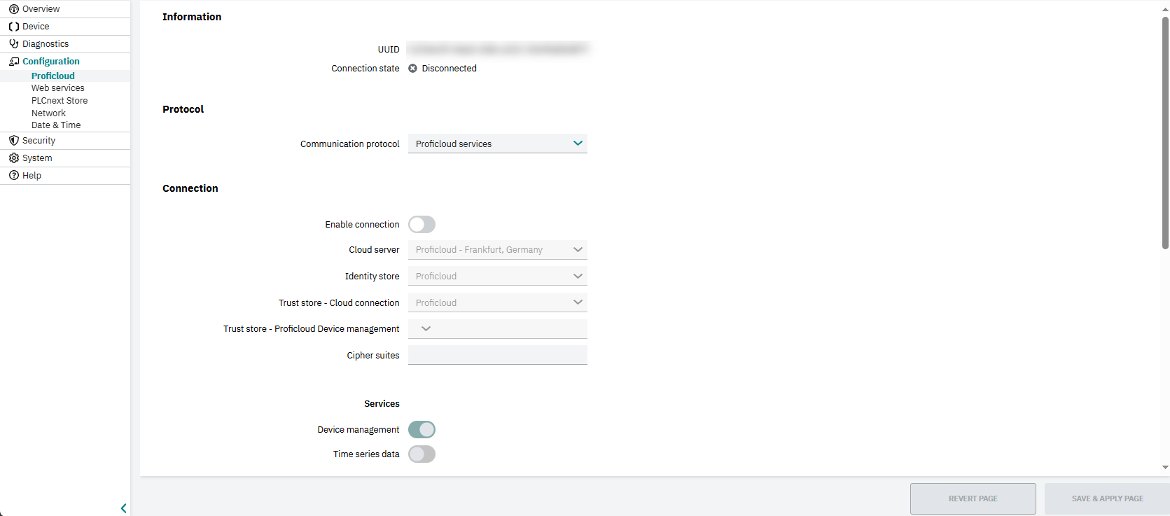 After the risk and threat analysis, configure the Proficloud as described in the main PLCnext Technology ‑ Info Center.