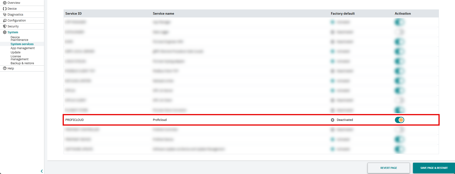 - Open the System services page (System → System services) in the WBM.