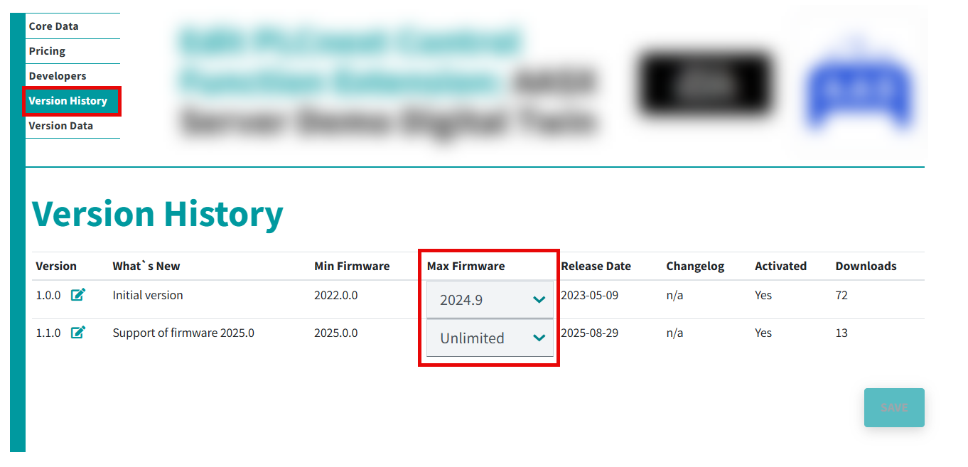 Check promptly whether your app is compatible with the latest firmware. If the app is not compatible, please add the corresponding max. firmware version for each app version in the PLCnext Store in the Version History under Max Firmware in your user profile. Proceed as follows: